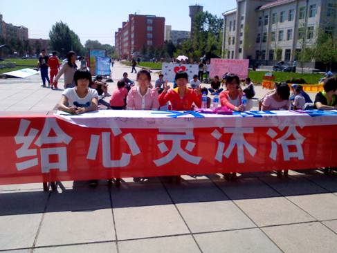 本次活动以“呵护心灵,关爱成长”为主题。活动现场分为心理咨询区、心理测试区、心理游戏区、签名及宣传区、绘画与图片展示区。大学生心理健康教育中心教师及心理学专业研究生对同学们在专业学习、人际交往等方面的心理困惑,给予了耐心细致的解答。有40余名学生到现场进行心理咨询,260余名学生做了焦虑、抑郁、情商等方面的心理测试;“情有千千结”、“传递呼啦圈”、“有错你就说”等心理游戏吸引了500多名同学参与其中;设计精美、内容丰富的心理健康知识板报展、“心灵的色彩”主题画展、“图写大爱,情暖人间”图片展,更是引来了一批批学生驻足观看。另外,有近5000名师生在“呵护心灵,关爱成长”宣传条幅上签名,心理健康志愿者还现场分发宣传材料6000多份。