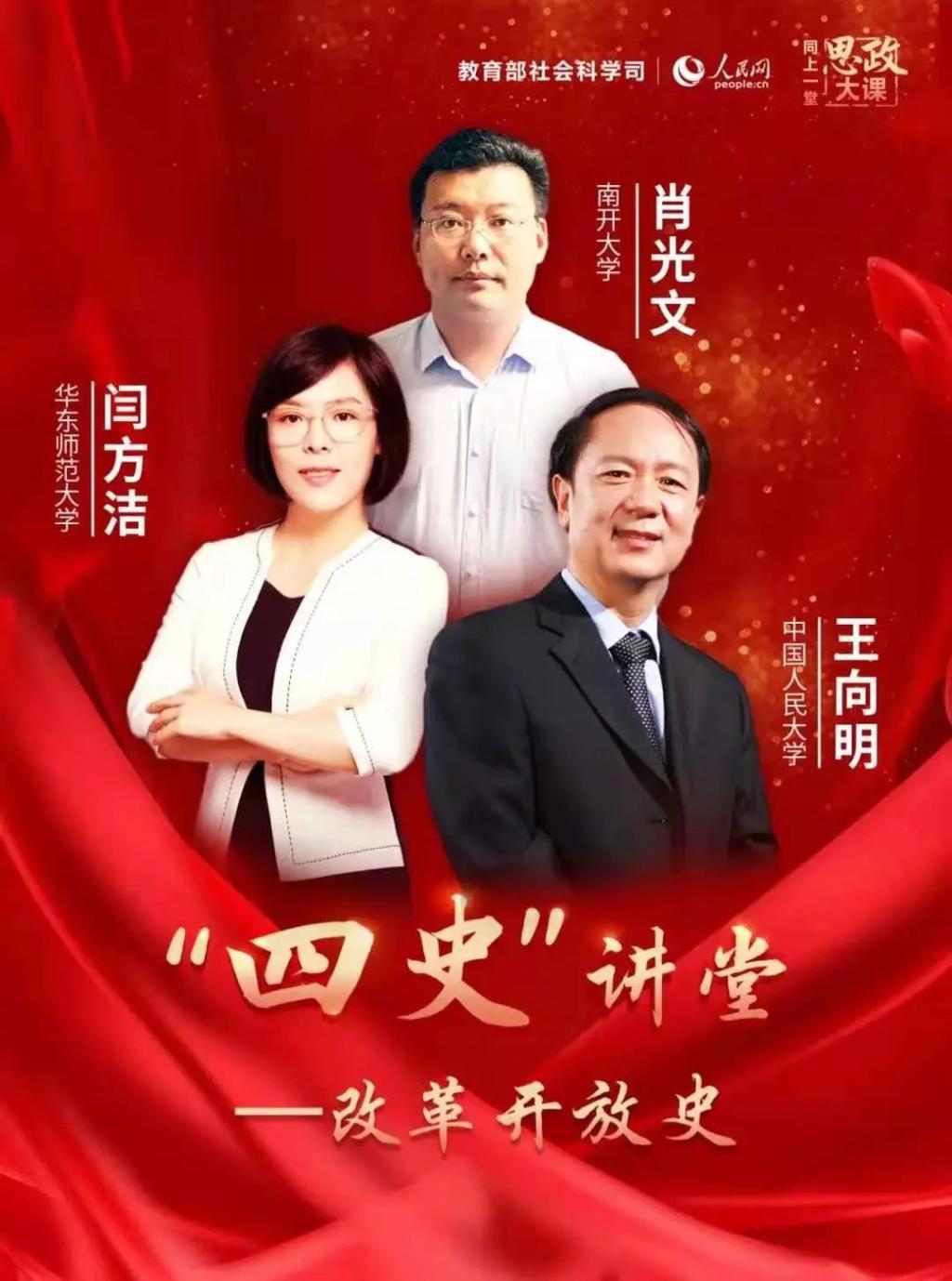 课程由华中师范大学马克思主义学院闫方洁教授、南开大学马克思主义学院肖光文副教授、中国人民大学马克思主义学院王向明教授为大家解读改革开放史,三位教授分别就“为何要走改革开放之路”“改革开放之路如何走”以及“改革开放的伟大意义和历史启示”作了专题报告。