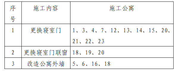 2024年暑假期间,学校将对学生公寓进行修缮和维护,具体施工内容和涉及公寓如下表: