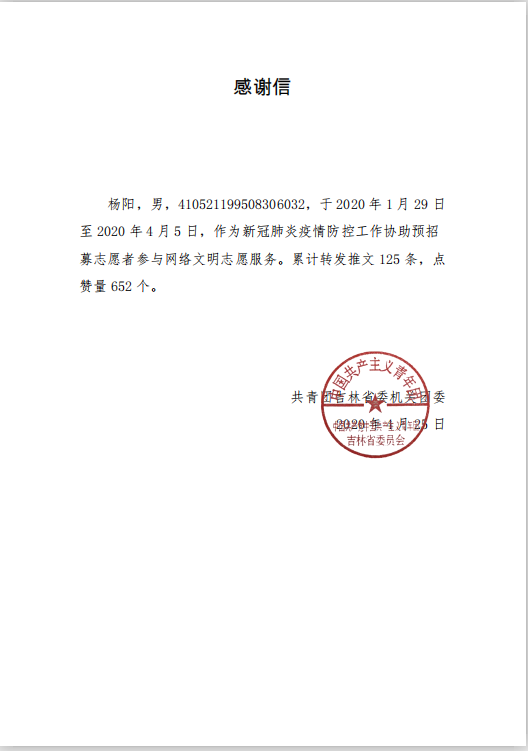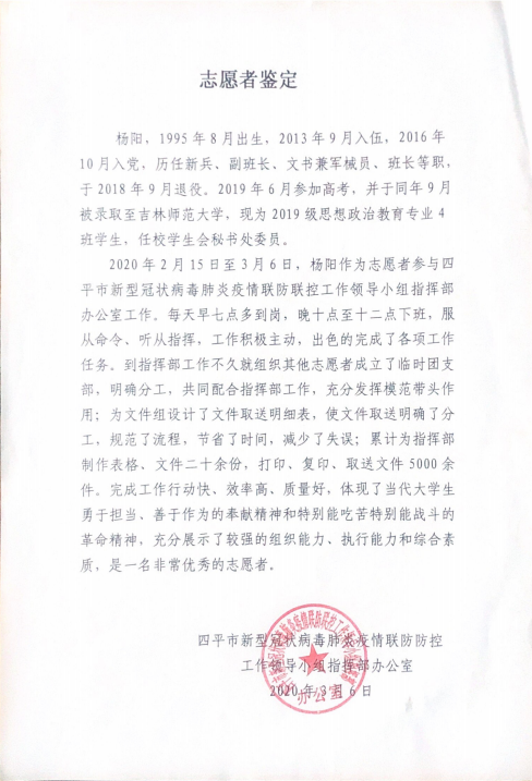 四平市新型冠状病毒肺炎疫情联防联控工作领导小组指挥部办公室志愿者鉴定