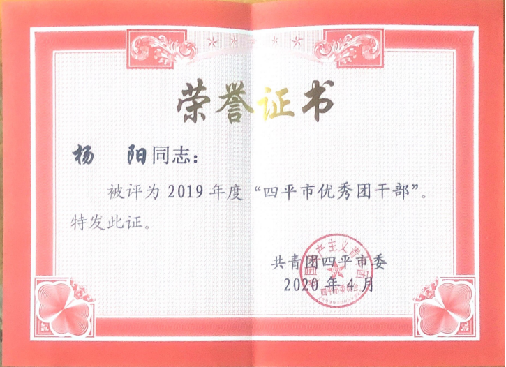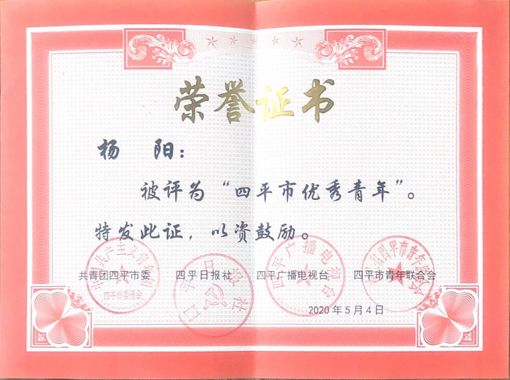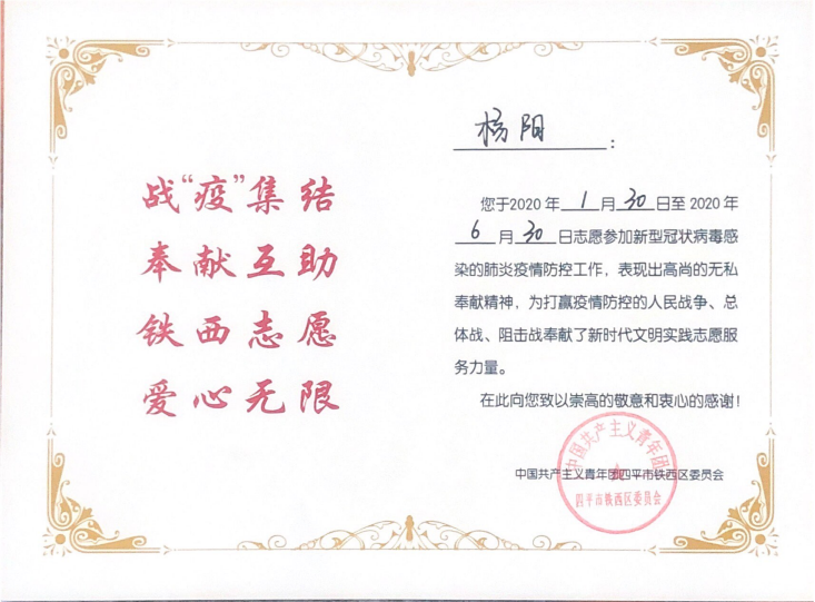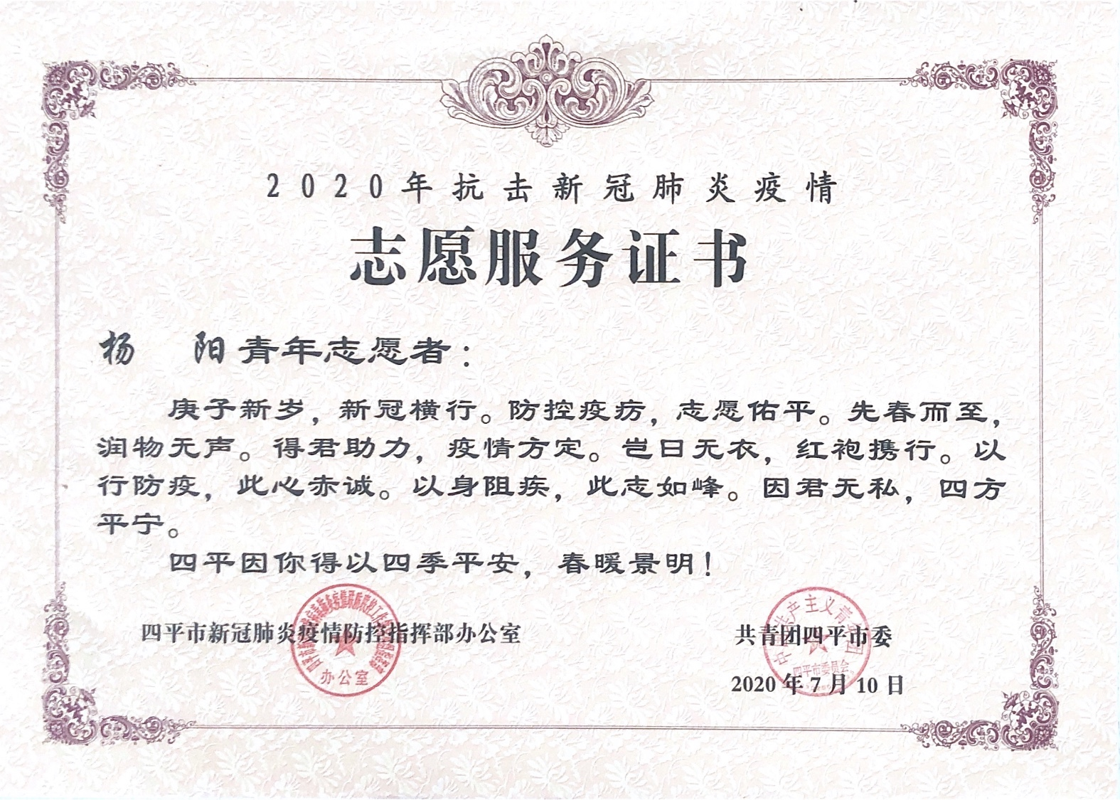 四平市新冠肺炎疫情防控指挥部办公室和共青团四平市委联合颁发的志愿服务证书
