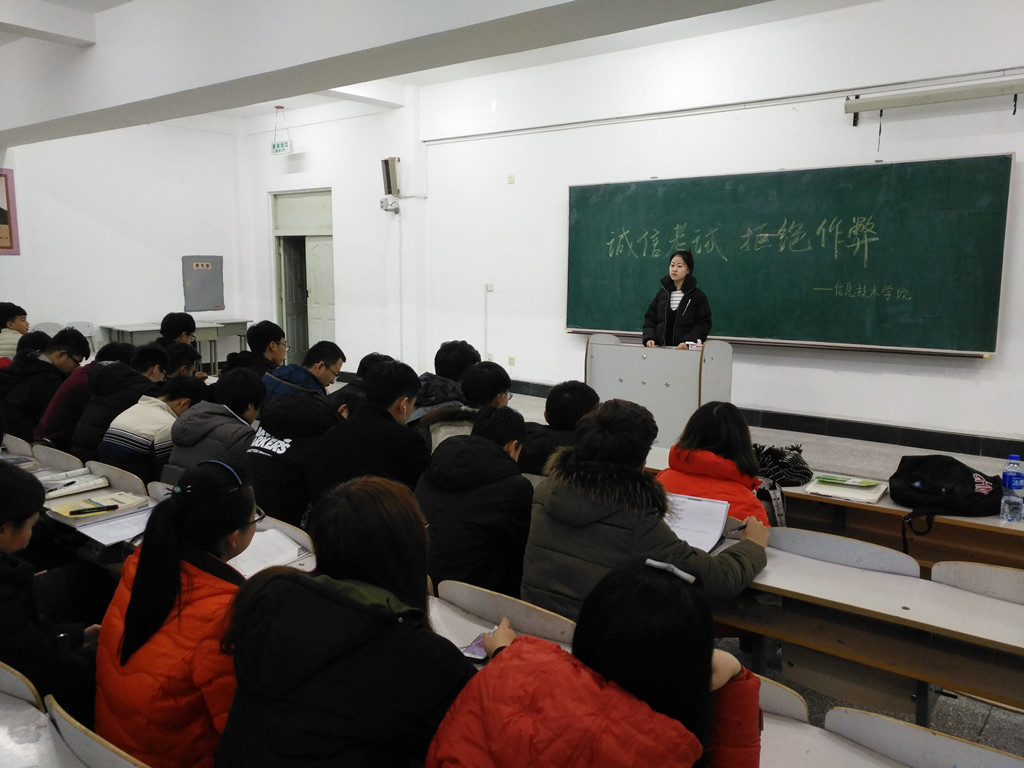 我院于2016年12月13日晚,在7401教室举办“诚信考试,拒绝作弊”的主题活动。活动中重点解读了《刑九》对于考试中参与、组织作弊和倒卖作弊器材等违法行为将面临的刑事处罚,同时,要求不得在公共网络平台、手机移动短信平台及QQ等传播和散布与考试作弊相关的信息。号召全体同学要刻苦学习,用自己的努力获取真实的成绩,不要以身试法,而悔恨终生! 活动后,各年级学生重温学期初签订的诚信承诺书。