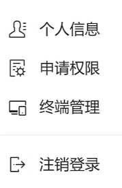 点击屏幕左下方图标,会显示个人信息、申请权限、终端管理和注销登录。