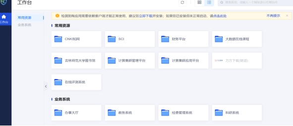 3.进入页面后可以看到工作台,这里分常用资源和业务系统两部分。师生可以根据自己的需求选择对应系统。