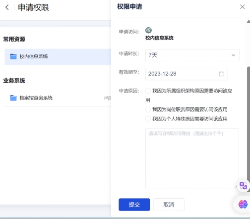 个人信息可以查看本账户的基本信息;申请权限可以额外申请七天校内信息系统或者档案馆查询系统使用权限;终端管理可以查询到本账号曾经的登录记录。注销登录可以彻底退出本系统。