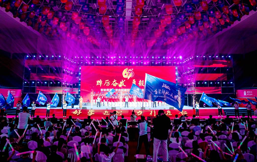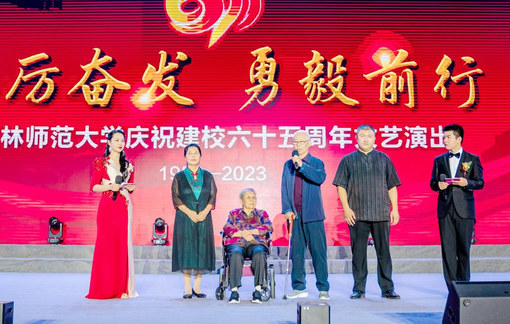 演出以歌舞、合唱、乐器演奏、创意舞蹈展示等多种形式全方位展示了全校师生拼搏进取、善于创新、自强不息的精神风貌。气势恢宏的学校65周年宣传片,立体呈现了吉师65年的光辉历程,彰显了吉师人“为党育人、为国育才”的不懈追求和深厚情怀;小合唱《我和我的祖国》,由退休教师、青年学生和少先队员三代人联袂演唱,深情表达了吉师人浓浓的爱国情和拳拳的报国心;校旗传递《弦歌永续》创意新颖,不同时期的校旗、17个学院的院旗在璀璨的聚光灯的映衬下熠熠生辉,生动表现了吉师人与学校荣辱与共,休戚相关的血肉深情。演出现场,荣获吉林省首届教育世家称号的陈铁楠老师一家人的感人采访,获得师生的阵阵掌声,新一代吉师人也将传承好、发扬好吉师师者的光荣传统,坚决扛起时代使命,展现青春担当,续写育人华章。歌伴舞《相亲相爱》,昭示着新时代的吉师人将继续勠力同心,苦干实干,朝着特色鲜明、多学科协调发展的高水平师范大学目标阔步前进。