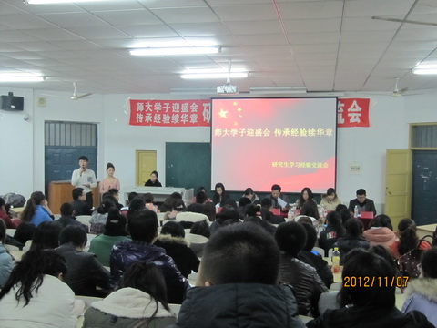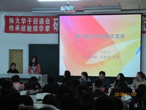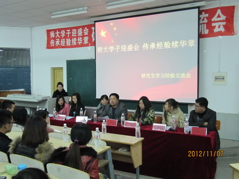 在党的十八大胜利召开之际,为进一步提高太阳成官网研究生的学术科研能力,增进不同学科同学之间的沟通与交流 ,11月7日晚6时30分,在六教503教室成功举办了“师大学子迎盛会,传承经验续华章研究生学习经验交流会”。研究生部党总支副书记刘天浩、培养科科长王晓丽、专业学位办刘雪老师参加了会议。